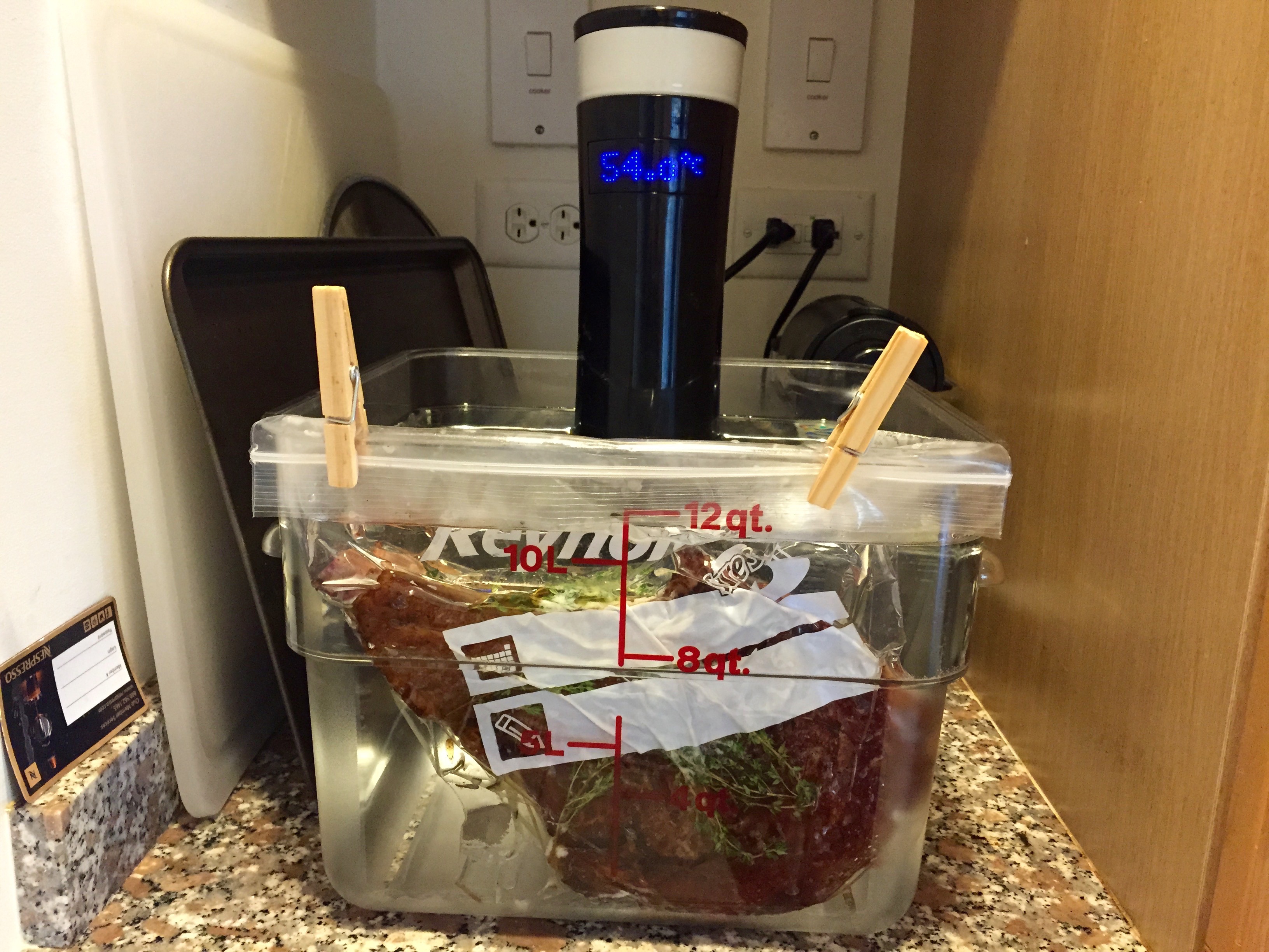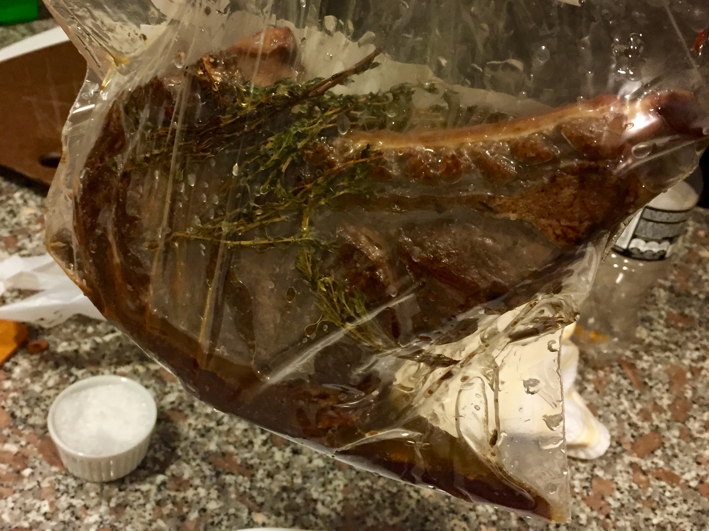 Meanwhile I caramelize onions, as well as brown another lot of onions with carrots and celery until color forms on the bottom of the pot/pan. Deglaze all the pans with white wine and add all the ingredients together. Add water to fill the pot to the top. I also add some chopped pancetta for flavor. Cook on very low heat for 6 hours. Remove the lid after a few hours to encourage evaporation. We want a nice thick sauce left at the end. Add more water during cooking if necessary. After six hours the meat should be falling off the bone.