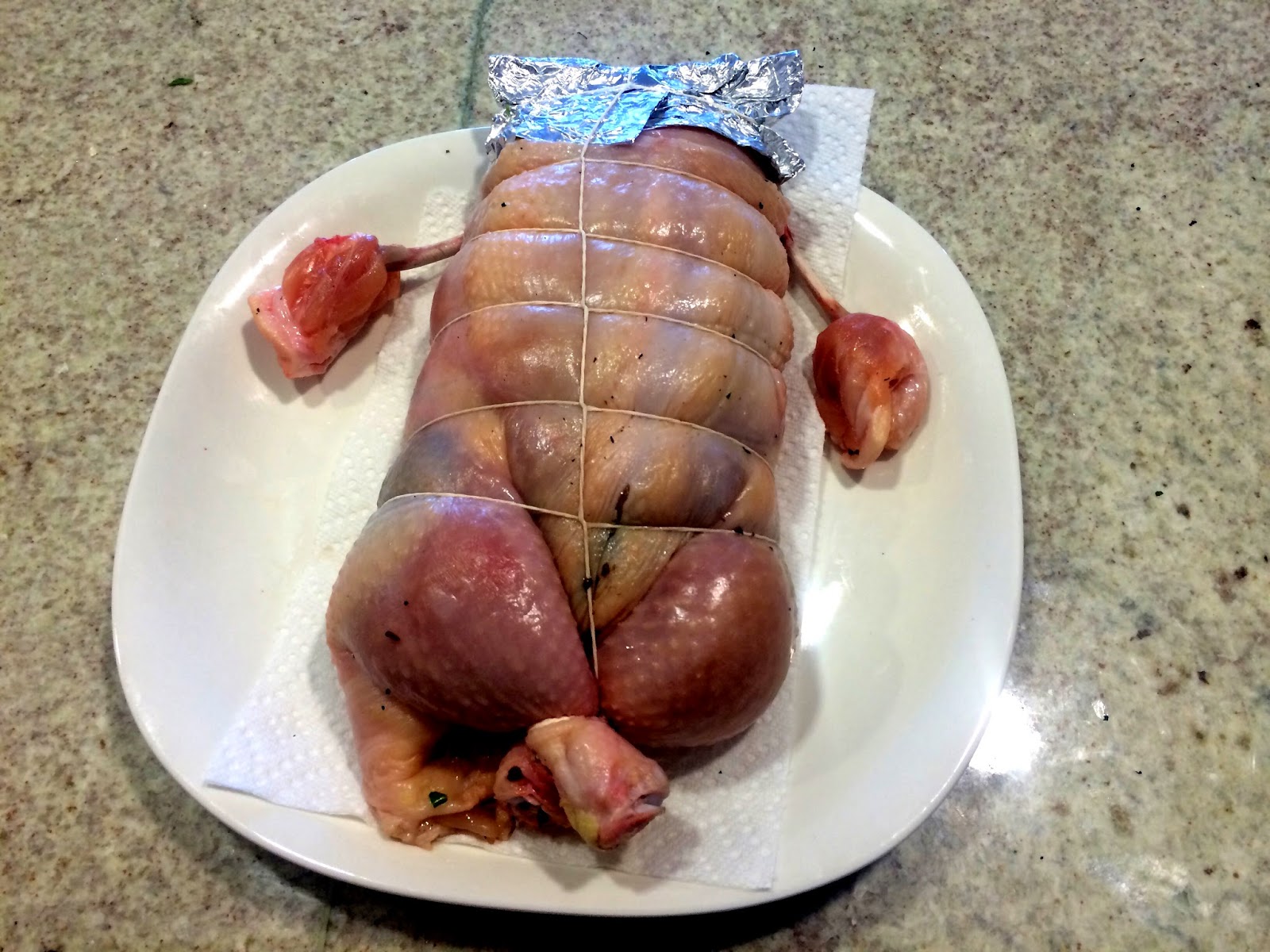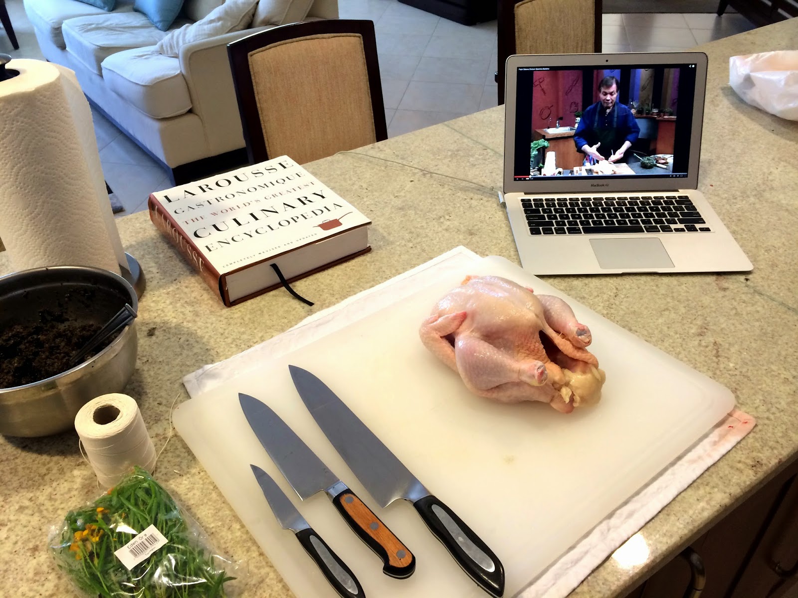 In the effort to support the local economy I attempted to cook a recipe with ingredients sourced domestically. This is exceedingly difficult in a small island economy. The ballotine of chicken is a deboned chicken that is stuffed with some kind of substance, rolled up, and roasted. It took me a fair bit of time to put together, but with practice that time could be reduced significantly