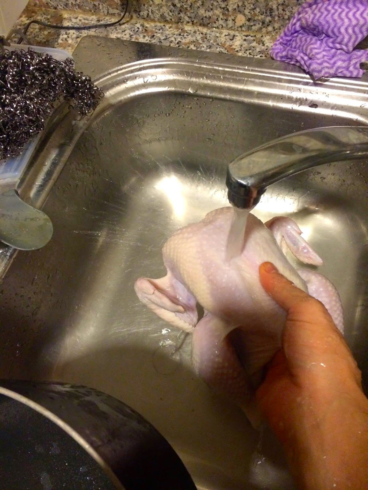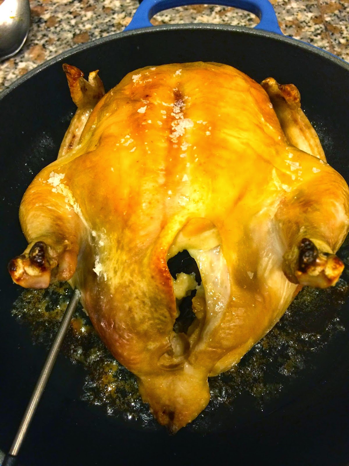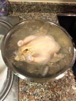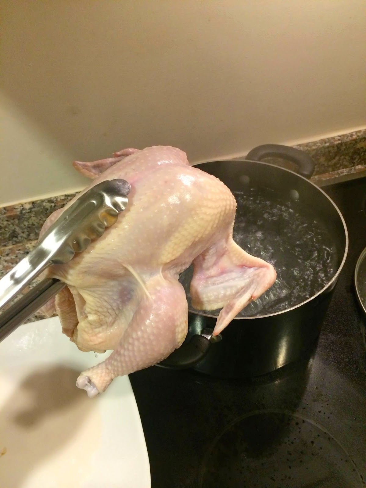 2. Copying the Chinese technique of getting crispy skin on their roast duck, the chicken is placed into boiling water for 30 seconds, and cooled in an ice bath. This perhaps releases fat under the skin thus removing moisture (? no idea really).