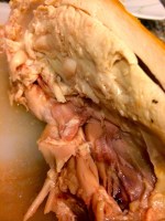 Above the juiciest bird I have ever eaten, with amazingly crispy skin. I have never had the thigh and breast perfectly cooked together. The middle picture is the underside of the breast and thigh when carved straight off the bone. The picture on the right shows the carved breast. The answer is the very low cooking temperature at the beginning. The brine also helped to keep the breast moist.