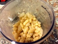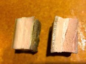 The cold pork belly from the two different cooking methods was sliced into equal portions and the skin scored. You could see the difference in the color of the cold cooked pork belly. The pork in the right of the picture below was sous vide cooked, it was pinker. The really big difference was noticed when scoring the skin of the pork, the sous vide pork’s skin scored much easier, even a blunt knfe could have got through it, whereas the oven cooked pork belly’s skin was still very tough. The second picture below shows the sous vide pork belly at the bottom of the picture. The skin looks thicker and and stronger in the top part of the picture. This makes a significant difference for the final fry.