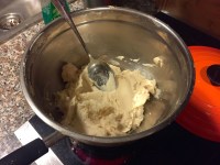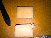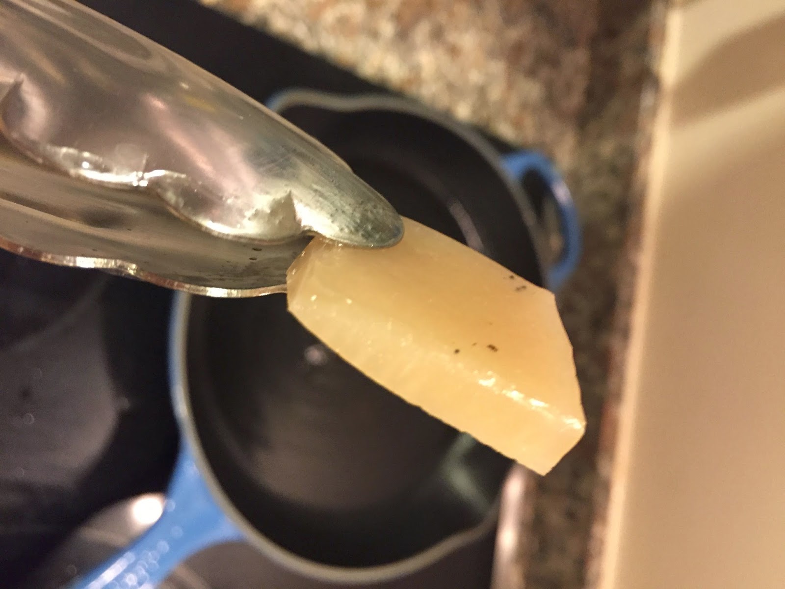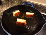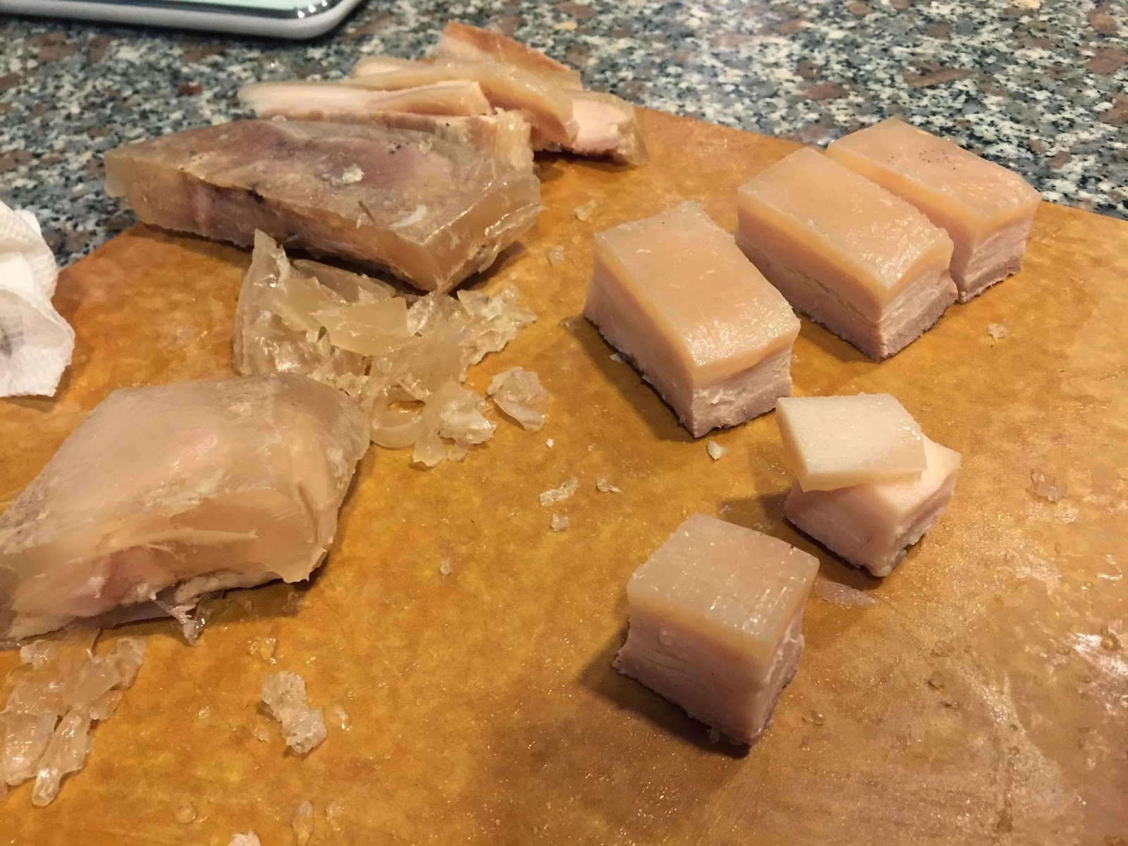 The cold pork pork is removed from the zip-loc bags, and portioned. The fluid from the bag is completely stiff given the release of gelatin during the 12 hours of cooking. It’s hard to describe how stiff this congealed liquid is. The portioned belly’s skin is scored to help release fat during frying and to help crisp the skin.