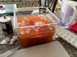 The dissolved brine solution is placed in iced water (in the correct proportions to maintain the five percent salt/water ratio). The pork is left in the brine for 24 hours. After 24 hours, the pork is soaked in water for an hour so the surface of pork is not too intense (last picture is the post-brine rinse). The pork is dried and left to rest in the fridge for another hour so to help the brine spread evenly throughout the meat.