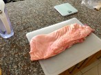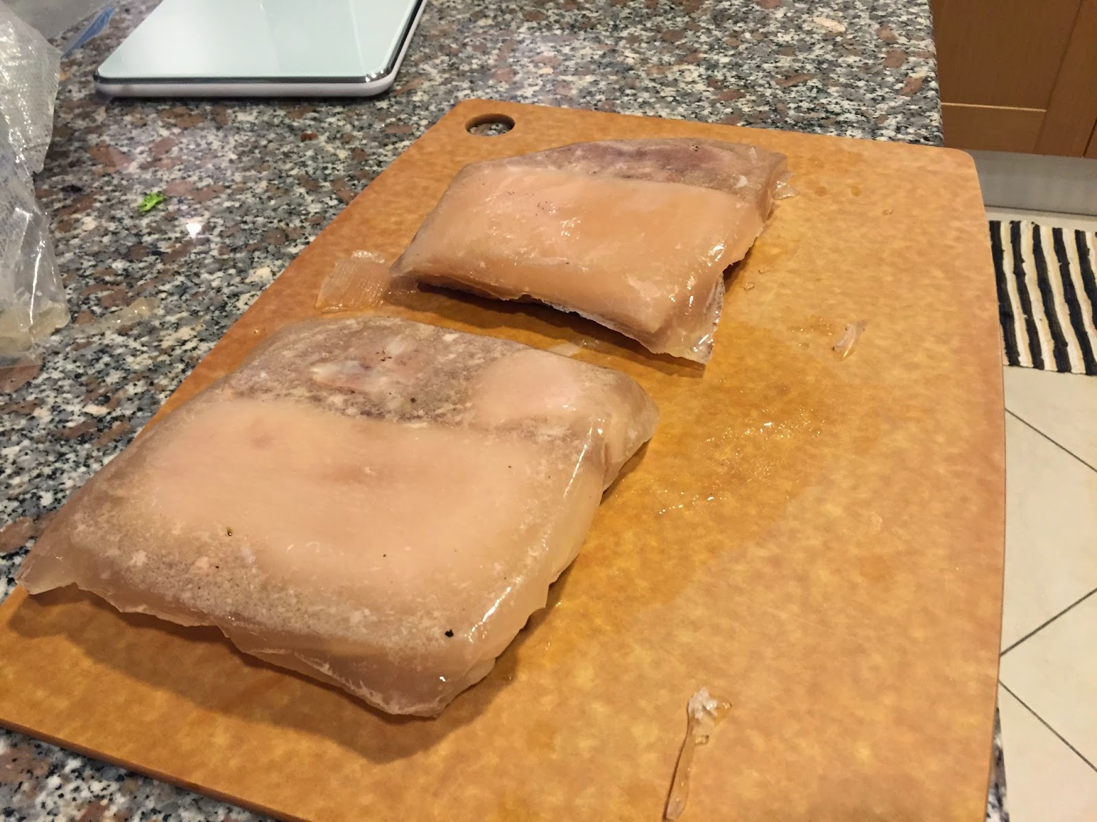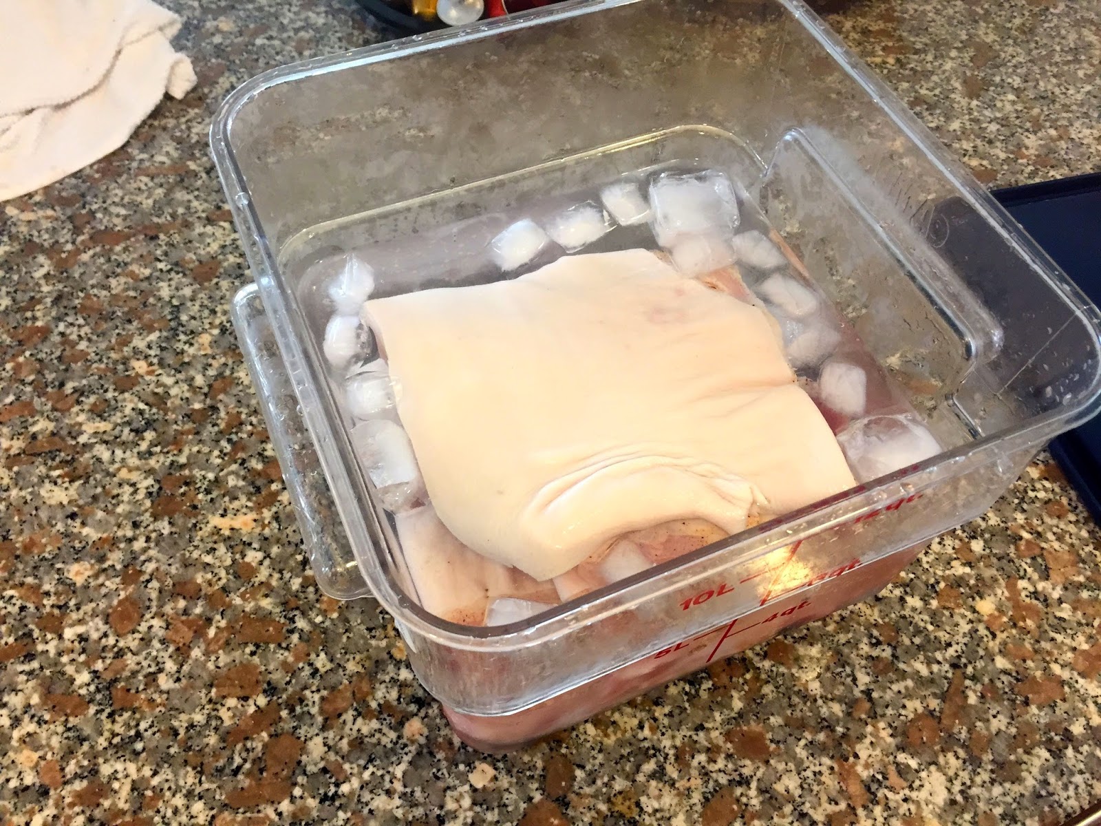 The belly is cut to fit into vacuum sealed zip-loc bags. The bags are immersed into a water bath at 77 degrees celsius for 12 hours and then removed to cool in the fridge overnight (last picture shows pork after removed from the water bath after 12 hours)